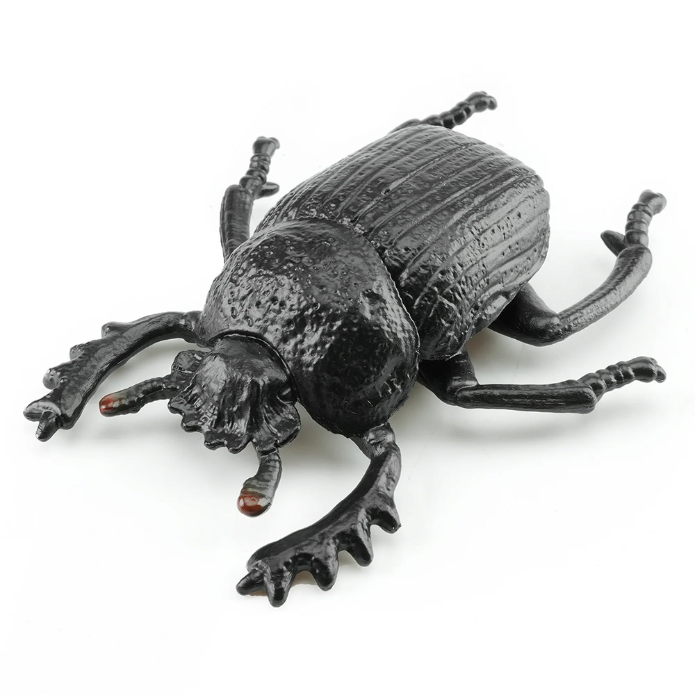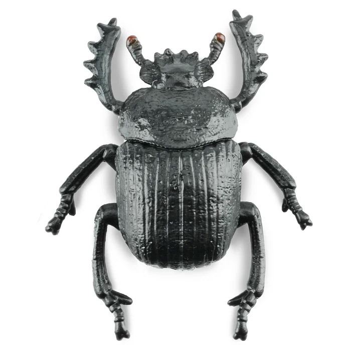 Figura del escarabajo pelotero sagrado (Scarabaeus sacer). Vive en regiones cálidas del norte de África, algunas de Asia y en el sur de Europa incluyendo la península ibérica, donde se le puede ver formando y rodando bolas de estiércol. Este comportamiento no solo es curioso, sino esencial para su supervivencia, ya que utiliza estas bolas como alimento y como lugar para poner sus huevos. Por su importancia cultural y su conducta única, una figura de escarabajo sagrado representa uno de los insectos más emblemáticos del mundo.