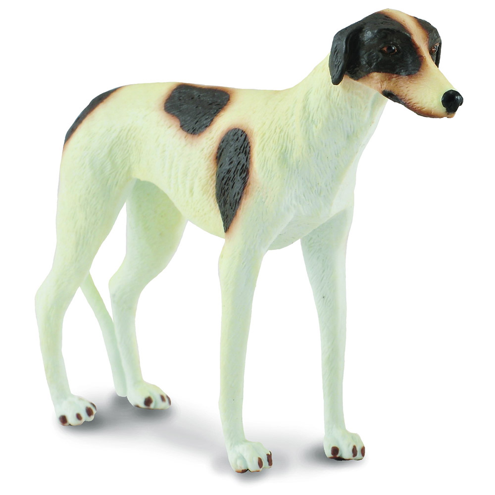 Figura de galgo inglés, raza de perro (Canis familiaris). También conocido como Greyhound, es originario de las Islas Británicas. Tiene una historia muy antigua y se cree que sus antepasados fueron llevados desde Oriente Medio a Europa hace miles de años. Su silueta estilizada y sus largas patas lo convierten en uno de los perros más rápidos del mundo, capaz de alcanzar velocidades de más de 60 km/h.