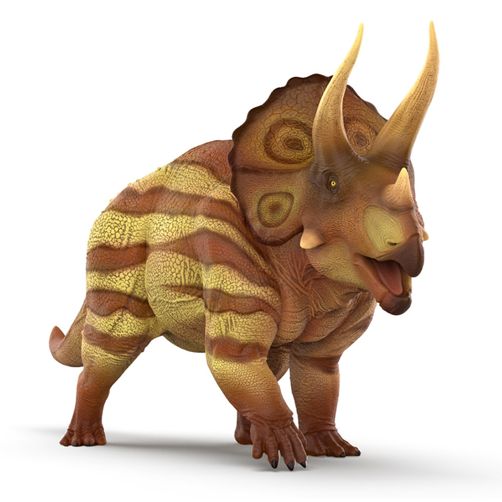 Figura de Triceratops horridus. El triceratops es uno de los dinosaurios más icónicos del período Cretácico, conocido por su enorme cabeza, su gola ósea y sus tres cuernos. Vivió hace unos 68 millones de años en lo que hoy es Norteamérica. Su cuerpo robusto y sus fuertes patas le permitían moverse con firmeza por las llanuras donde habitaba. Era un herbívoro que se alimentaba de plantas bajas como helechos y cicadáceas.